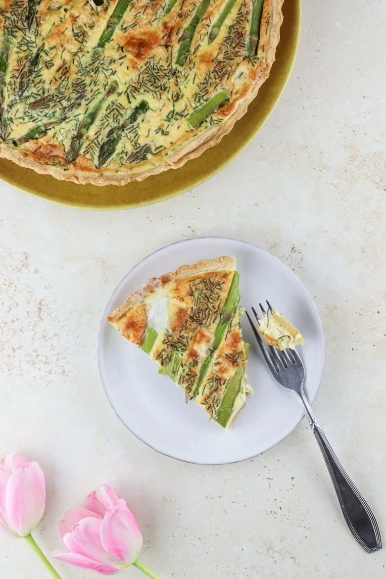 Spring is a time of renewal, and what better way to embrace the season with its signature veggie, Asparagus? Its vibrant green color and delicate flavor, take center stage in this quiche, adding a touch of elegance and freshness to every bite. The creamy richness of goat cheese and the subtle onion-like flavor of chives pair perfect with the slightly earthy, and nutty taste of asparagus